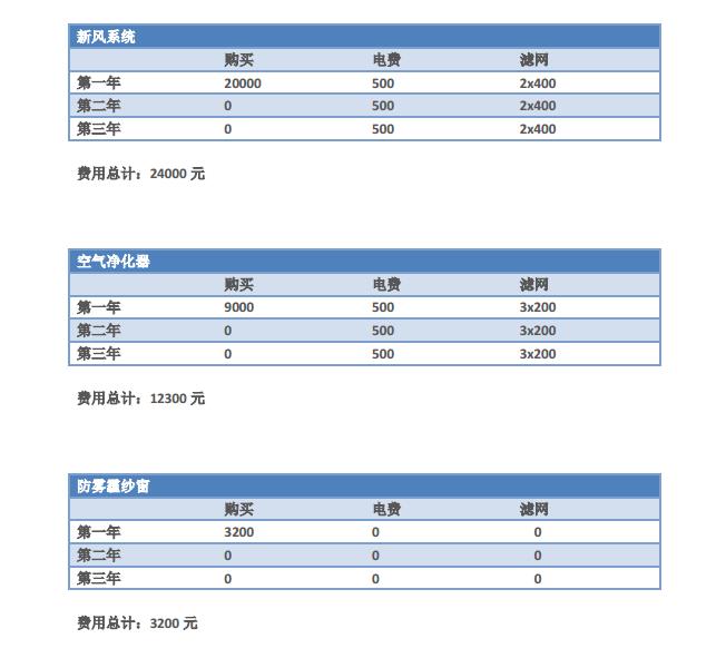 我们以一个120平的房子为例,如果需要全部空间进行净化,一般需要3-4台空气净化器,每台3000元,一年需要更换3次滤网,加上电费一年差不多需要12300元,空气净化器是在一个密闭的环境下工作,不能从源头上解决污染问题,除此之外,使用空气净化器还会有噪音及一定的安全隐患。购买新风系统一般需要2-3万元,每年需要更换2次滤网,一次400元,加上一年需要的电费,差不多需要24000元,费用比较高。纳米纱窗整屋安装只需要几千元,另外不需要更换滤网且无能耗,一年费用也仅仅是购买纱窗的几千元。
