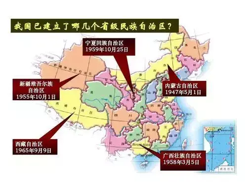 引申考点:我国有五个自治区:内蒙古、宁夏、新疆、广西、西藏(内宁新广西),最早成立的是1947年内蒙古。最晚成立的是1965年西藏。