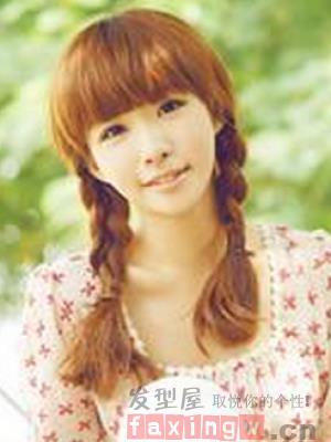 很合适小圆脸女生的一款双边编发发型,棕红色系的发色,时尚又不俗气,厚重的齐刘海,修颜减龄效果倍棒。