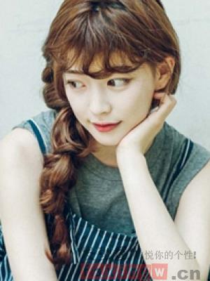 棕红色系的头发,打理成蓬松的侧边编发发型,白皙的脸蛋,搭配上条纹的上衣,简单慵懒更别致哦。