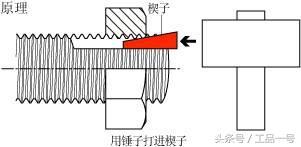 这个螺母第一眼看上去是双螺母防松,也就是摩擦防松,但是仔细一看又有点像下图,一个锲子打入上面的螺母,对不对?