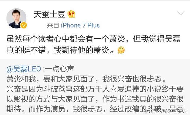 而天蚕土豆,近日终于也在微博上发声。他回复了吴磊的这条微博,也向原著粉丝们表达了这样一个态度,“这个萧炎就是他心目中的萧炎”。