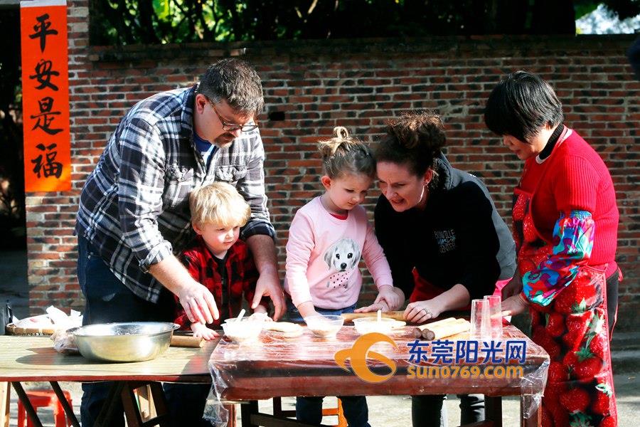 东莞阳光网团队制作《乐活在东莞》视频拍摄现场,外国家庭与非遗传承人一起做贺年糖果。