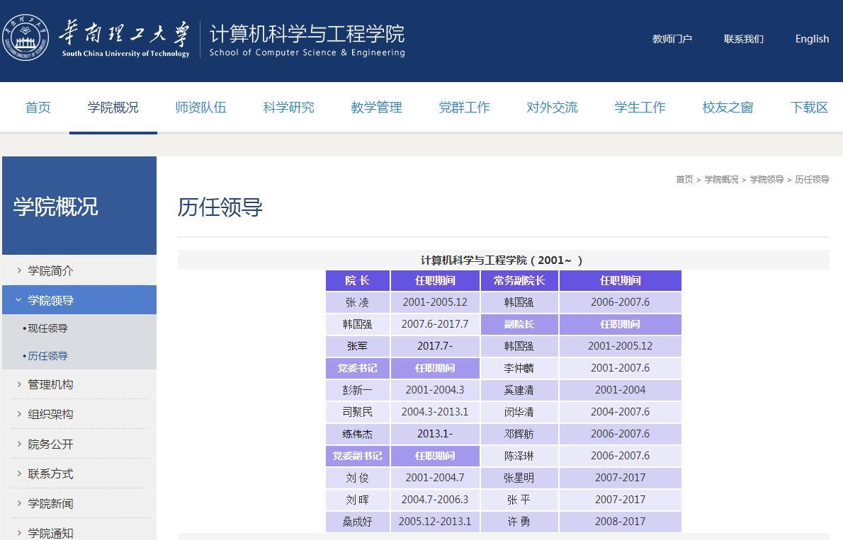 今天上午,纵相新闻记者登录该校官网,进入计算机科学与工程学院查看“现任领导”,发现院长、书记一栏均显示空缺,而点击“历任领导”,可以看到2017年7月以来该学院院长的确就是网贴爆料的张军,2013年1月以来党委书记也正是爆料中所说的练伟杰。