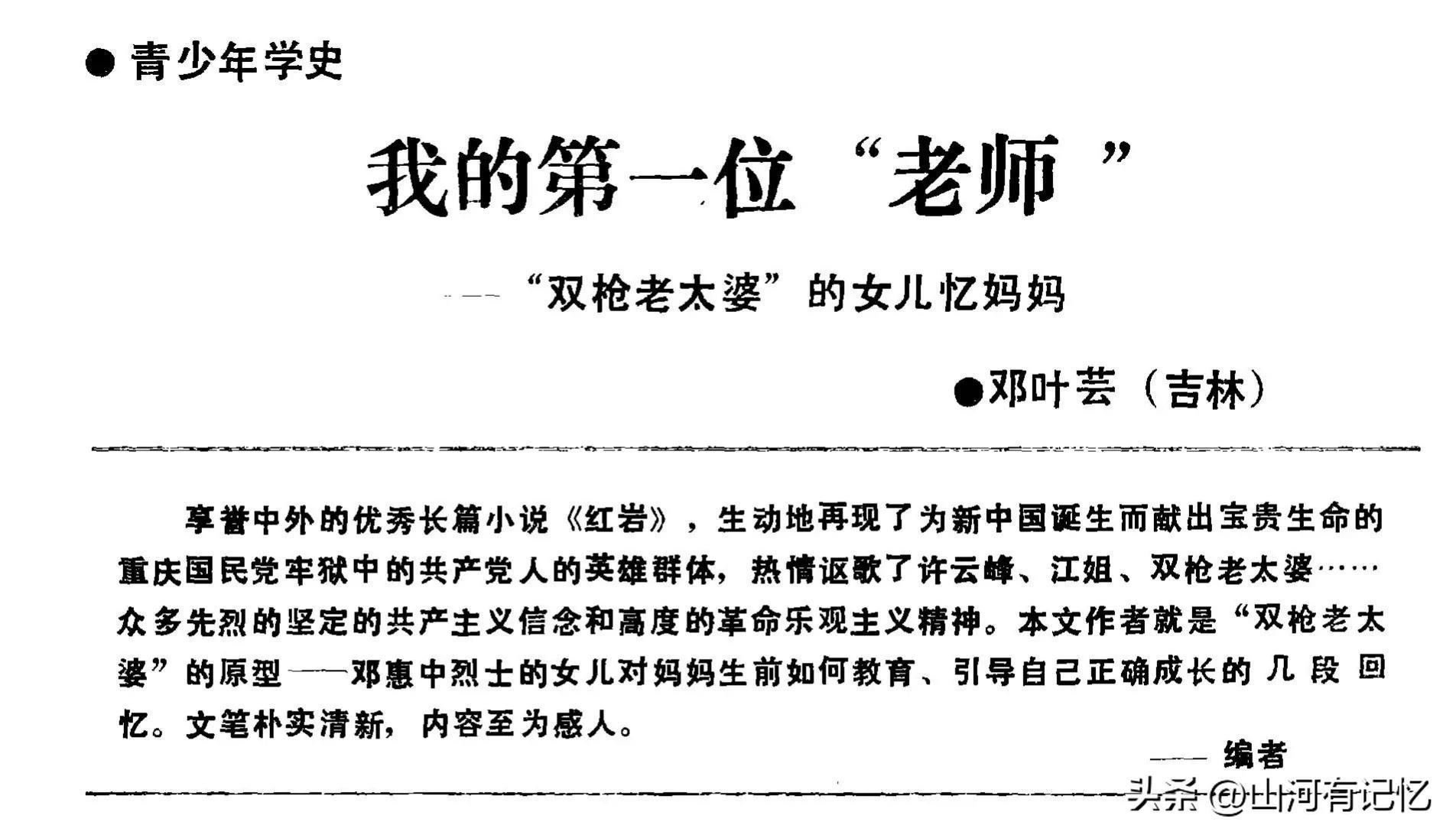 “作为《红岩》的出版机构,中国青年出版社的108号文档显示,‘双枪老太婆’最主要的原型之一叫陈联诗。1926年到1948年,陈联诗参与了华蓥山区的多次武装斗争,其传奇经历在华蓥山地区和重庆地下党中广为传扬。”