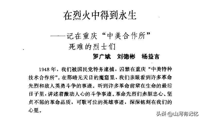 小说《红岩》的三位作者罗广斌、刘德彬、杨益言,都是从中美合作所魔爪下幸免的难友,解放后都在重庆团市委工作。他们写了很多回忆文章,缅怀、宣传难友们在狱中坚贞不屈,与反动派坚决斗争的感人事迹。