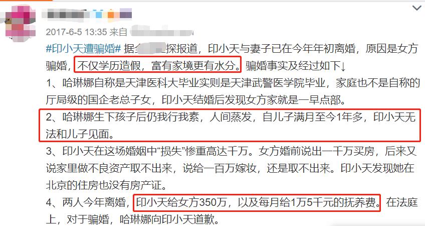 面对哈琳娜的要求,印小天没有同意,经协商用350万,结束了这场“骗局”,于2017年离婚,孩子太小,也判给了母亲。