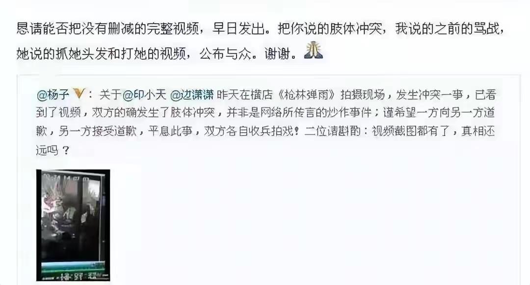 最后完整的视频被公开了,只见视频中边潇潇盛气凌人指着印小天,而印小天只是将她推开了而已,全程并没有所谓的“打人”和“扯头发”画面。