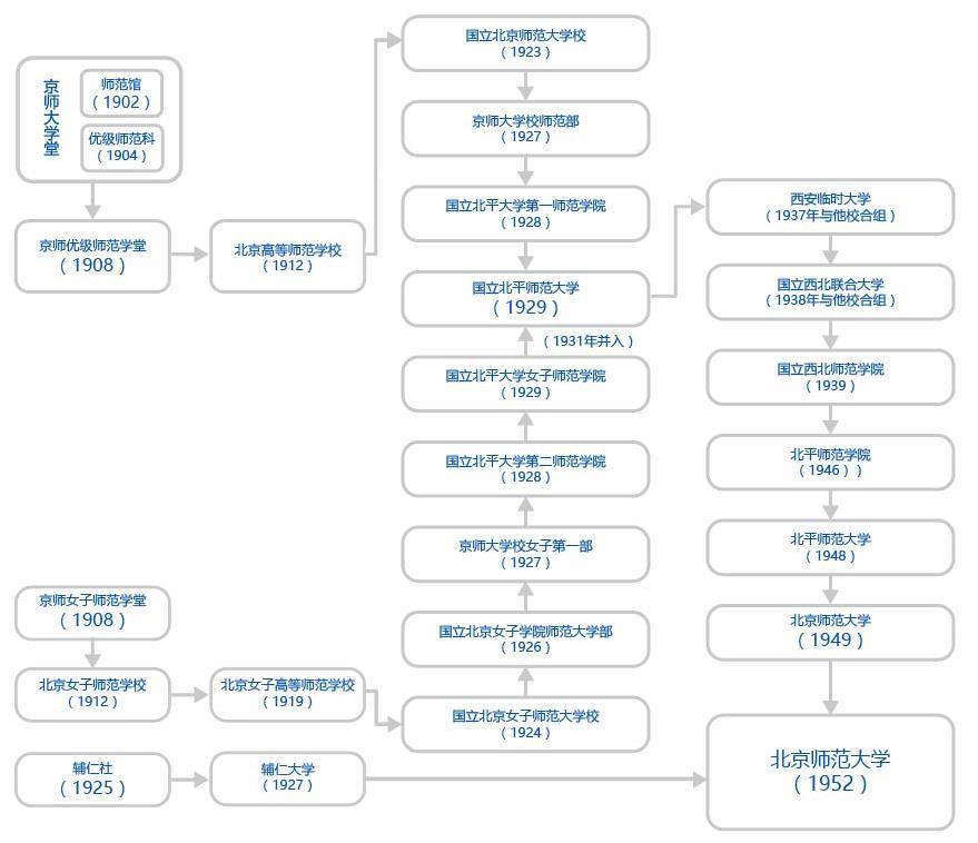 京师大学堂,中国第一所国立综合性大学,1902年其师范馆正式开学,当年录取学生仅130余名,这便是北师大的源头。中国高等师范教育由此起步,中国教育史上的一个新纪元由此开始。1908年改称京师优级师范学堂,独立设校,1912年改名为北京高等师范学校。1923年学校更名为北京师范大学,成为中国历史上第一所师范大学。1931年、1952年北平女子师范大学、辅仁大学先后并入北京师范大学。1996年北师大首批进入"211工程"建设计划,2002年"十五"期间,进入国家一期"985工程"建设计划。2012年建校110周年之际确立建设世界一流大学的目标,2017年入选国家"双一流"建设A类高校,2019年珠海校区正式获批,同年9月开始招生,北京师范大学"一体两翼"办学格局形成。