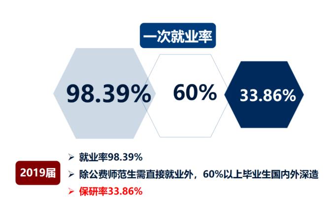 在北师大2019届本科应届毕业生中,除公费师范生需直接就业外,60%以上继续攻读本校及其他重点院校和科研单位研究生或到境外深造,其中推荐免试研究生(含本科直博生)占毕业生的33.86%。就业率达98.39%,毕业生就业领域广泛,主要进入科研机构、大专院校、政府机关、企事业单位、新闻出版部门、重点中学等单位或部门工作。硕士、博士毕业生就业率超过97%。