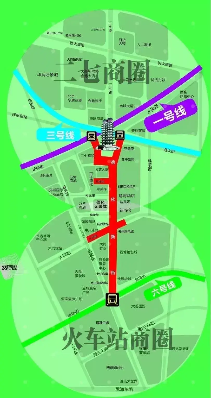 德化新街贯通二七、火车站两大城市核心商圈,拥有郑州火车站、汽车客运总站每日数十万的客潮,以及地铁1号线贯穿东西大学城的20余所院校70万师生,消费客群数量非常之大。