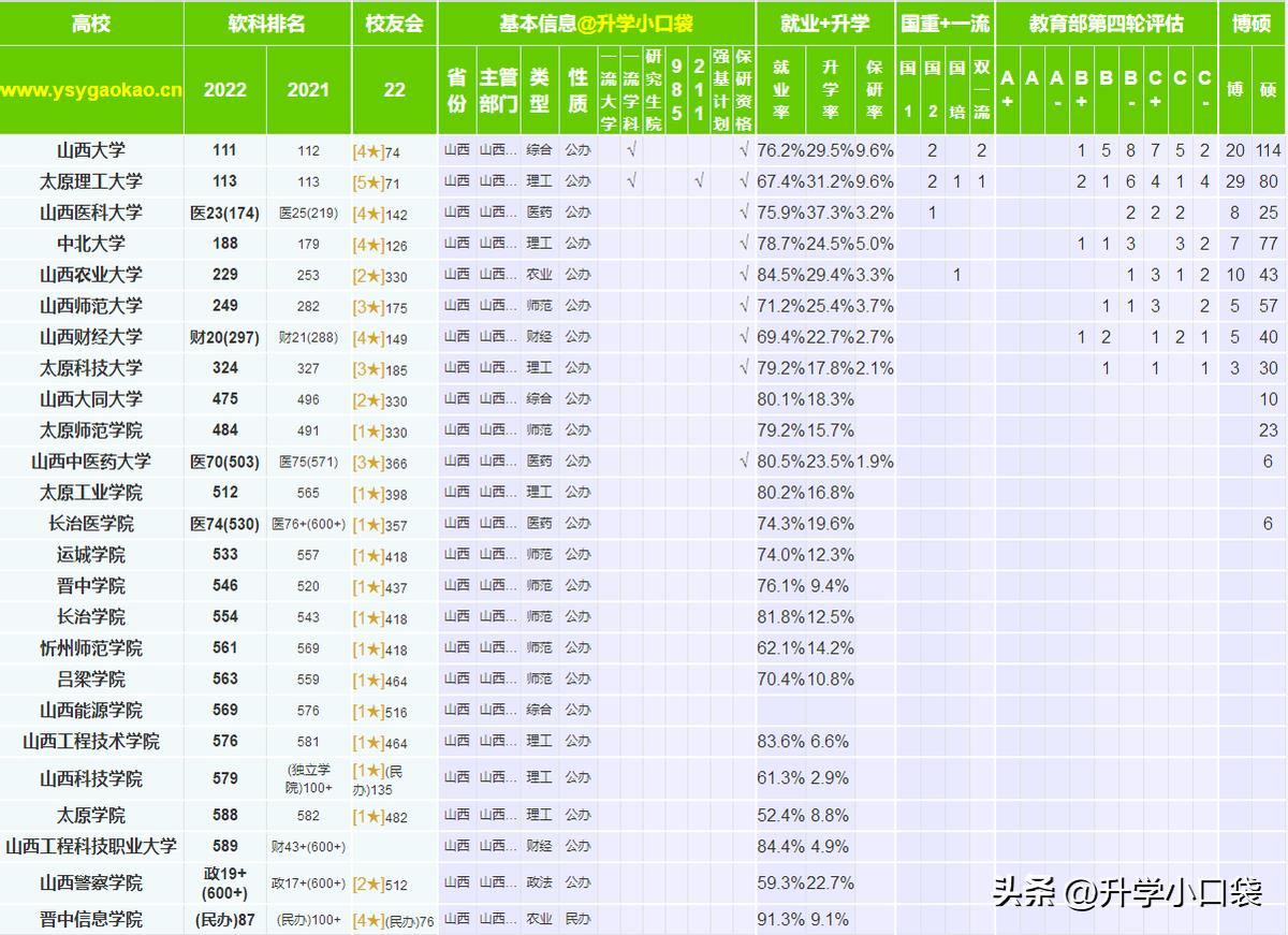 本文来给大家介绍一下山西省25所高等院校的全国排名数据。从全国高校排名数据来看,山西大学排在第111名,太原理工大学排在第113名。山西医科大学和中北大学分别排在第174名和第188名。全国200强高校中,山西省的高等院校有四所。