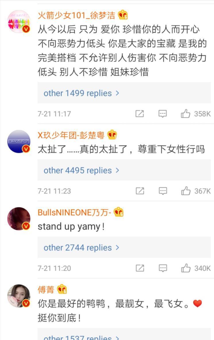 在Yamy 曝光相关信息以后,大众做出了不同的反应。一部分明星,比如杨超越、乃万等人都对Yamy表示了支持,表示Yamy前老板的言行是对女性的侮辱,也肯定了Yamy的时尚、Yamy独一无二的美。