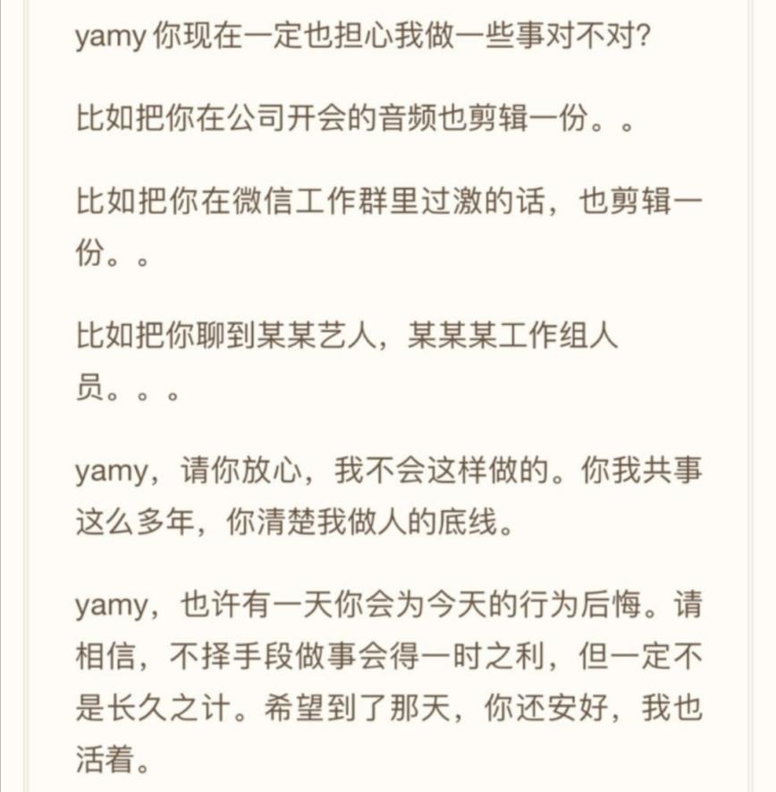 其中最细思极恐的就是Yamy 自曝解约受到死亡威胁,在受到死亡威胁之前,Yamy先是受到了言语方面的人身攻击,被自家老板在会议上吐槽丑到忍受不了,甚至逼迫其他员工认同。之后,Yamy选择与公司解约但是受到了自己老板的威胁。随后Yamy便在微博上曝光了她老板在员工大会的录音。