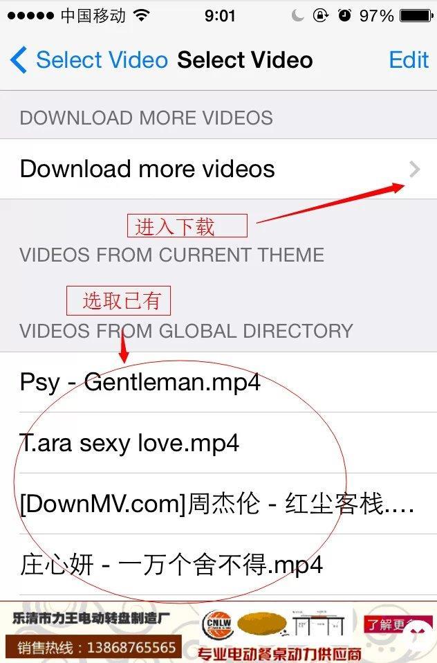 ownload more videos为里面自带的视频,应该是有两个,在下面 videos from global directory下的选择项,是自己拷贝进去的视频片段,点击预览即为选择用该视频作为来电视频,进去之后选的第一个就设为铃声,再点其他的视频也是无效的,记得,是第一个点击的视频就是设为铃声了!