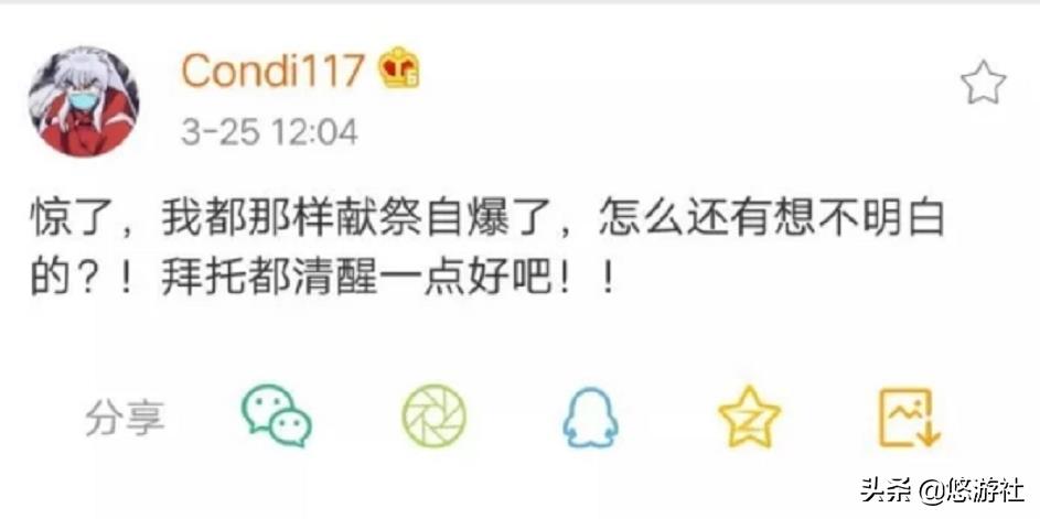 这件事却又突然出现另一个人,LPL首个涉及“菠菜”的选手condi现身微博:“惊了,我都那样献祭自爆了,怎么还有想不明白的?拜托都清醒一点好吧!”Condi当初的情况和现在一样,同样是被人举报,也同样自称收住了手。这句话的言外之意就是:“我当初被人利用,已经自爆了,怎么还有人吃亏。”