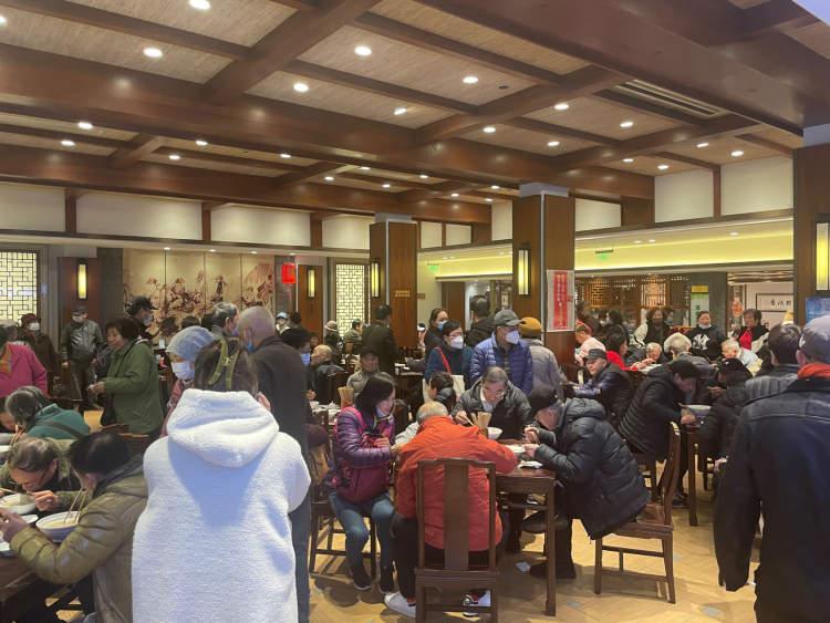 在刀鱼季晨报记者曾在现场看到,10点左右,老半斋大堂经理朱翠华一分钟内要处理十几张刀鱼汁面的单子,有时候,她自己也要端着刚刚出锅的刀鱼汁面给着急等待的顾客送去。中午11点,店内已经座无虚席,12点,进店的食客仍然络绎不绝。甚至还有推着轮椅来老半斋的老奶奶,自己推着轮椅走入店中。