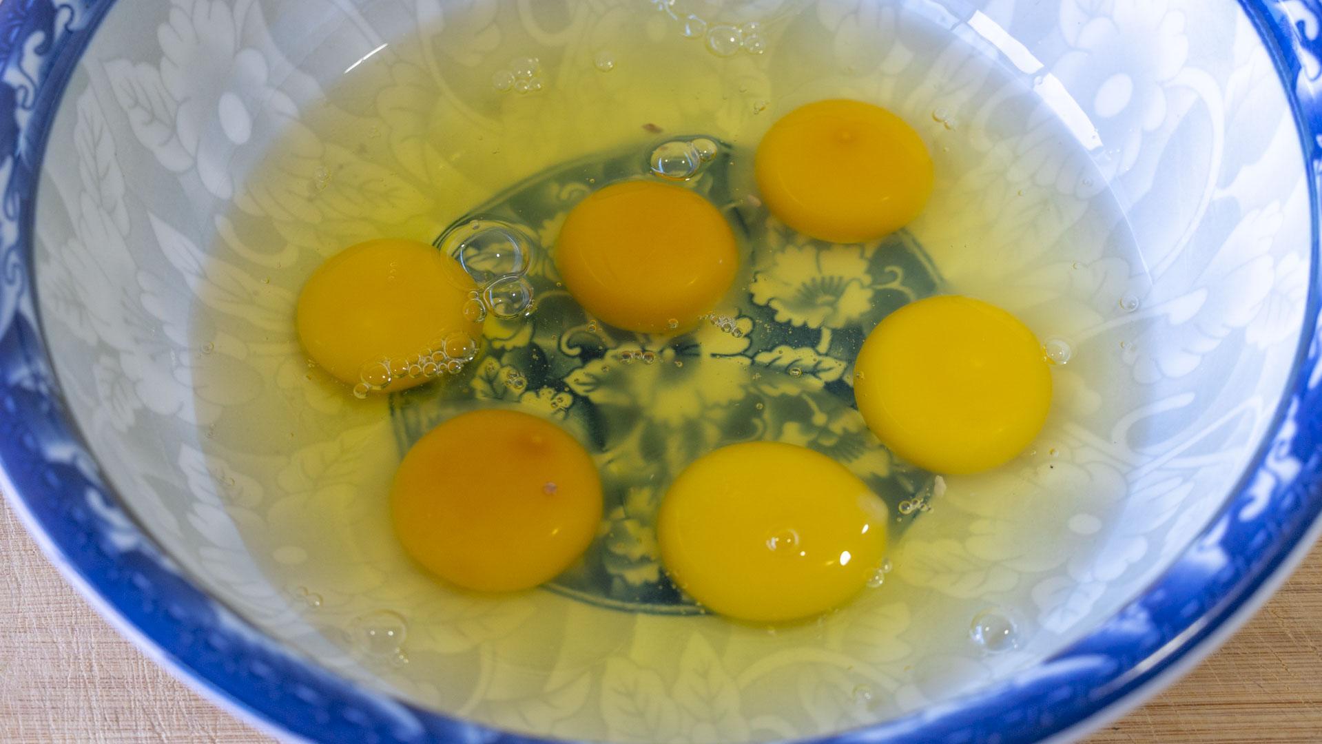 4、另准备一个碗,打入6个鸡蛋,再加一勺盐、几滴白醋、少许胡椒粉,搅打均匀。