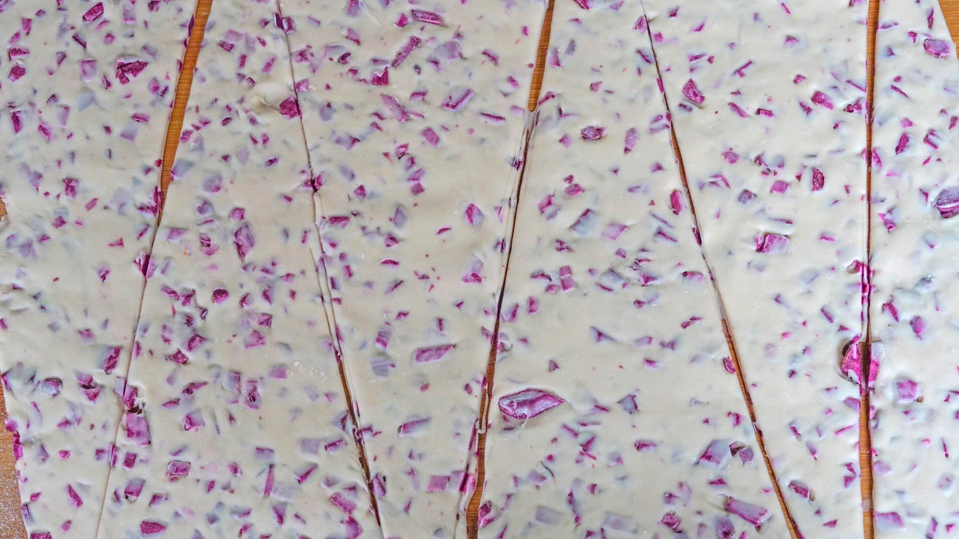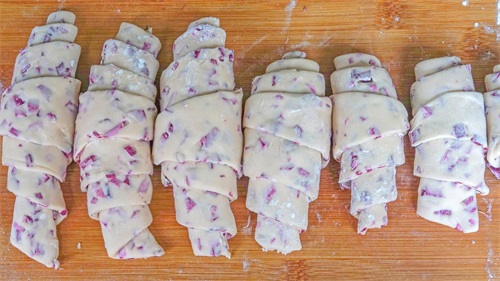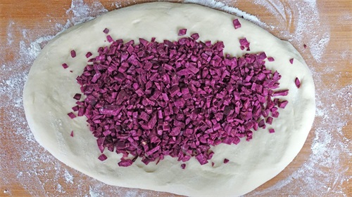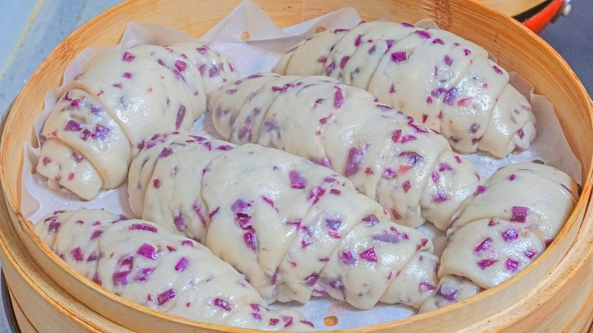 卷起来,好看的紫薯花卷生坯就做好了;