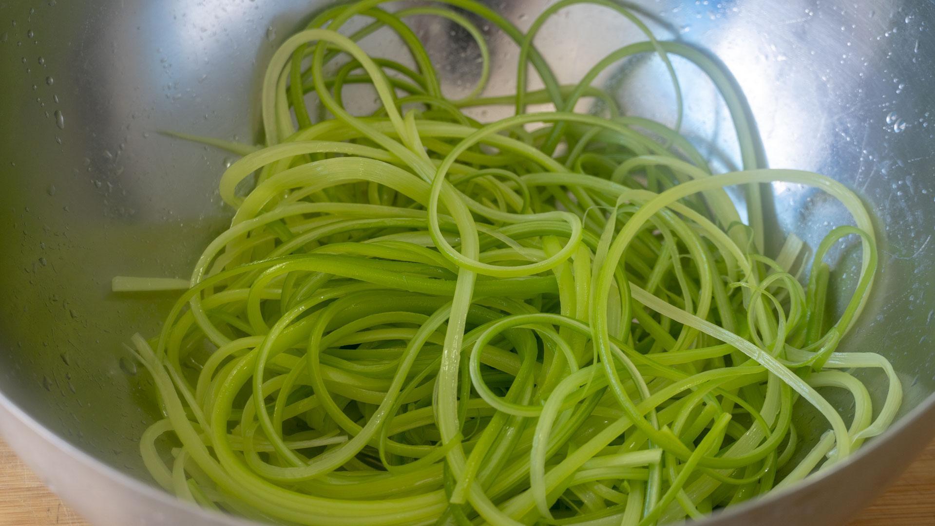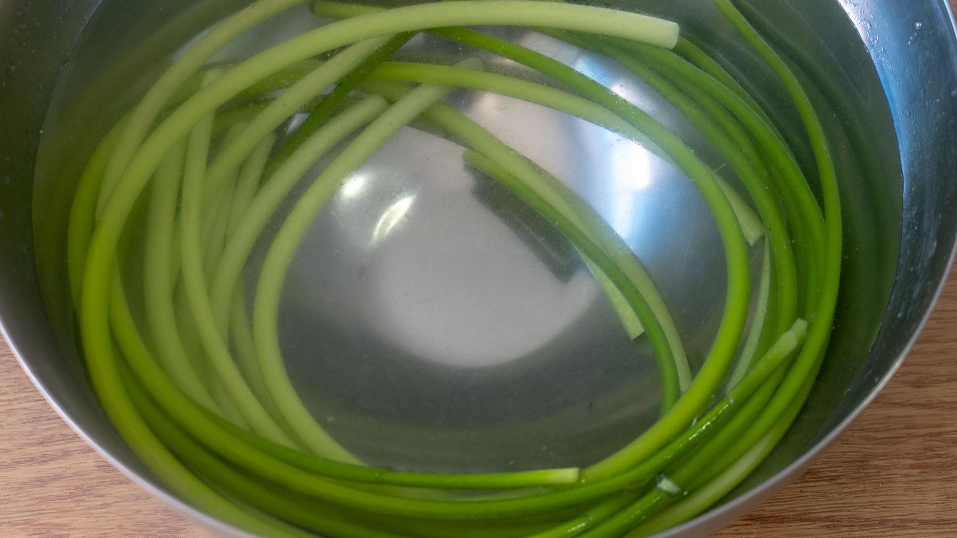3、蒜苔断生后捞出来,立马过一下凉水,颜色和口感都会更好。