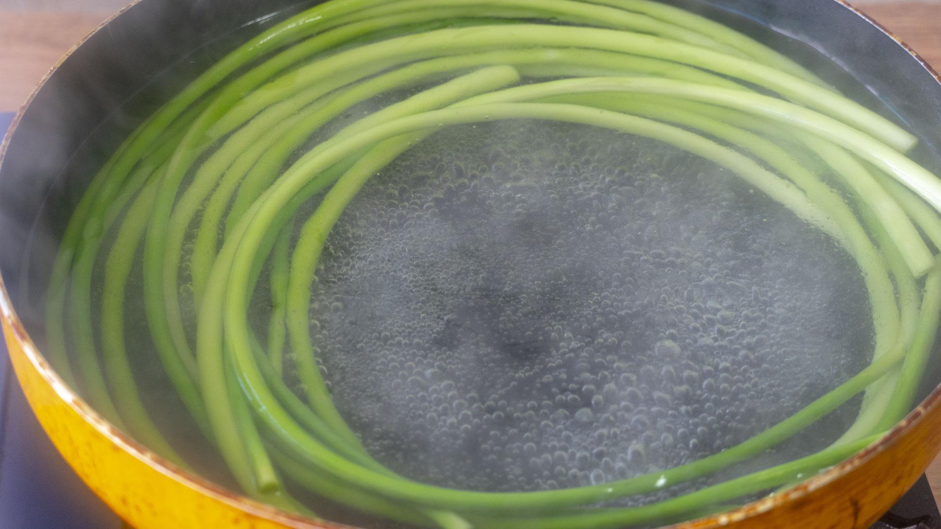 2、锅中放水,加1勺盐和1勺油,水开后放入蒜苔焯水,一分钟就差不多了。