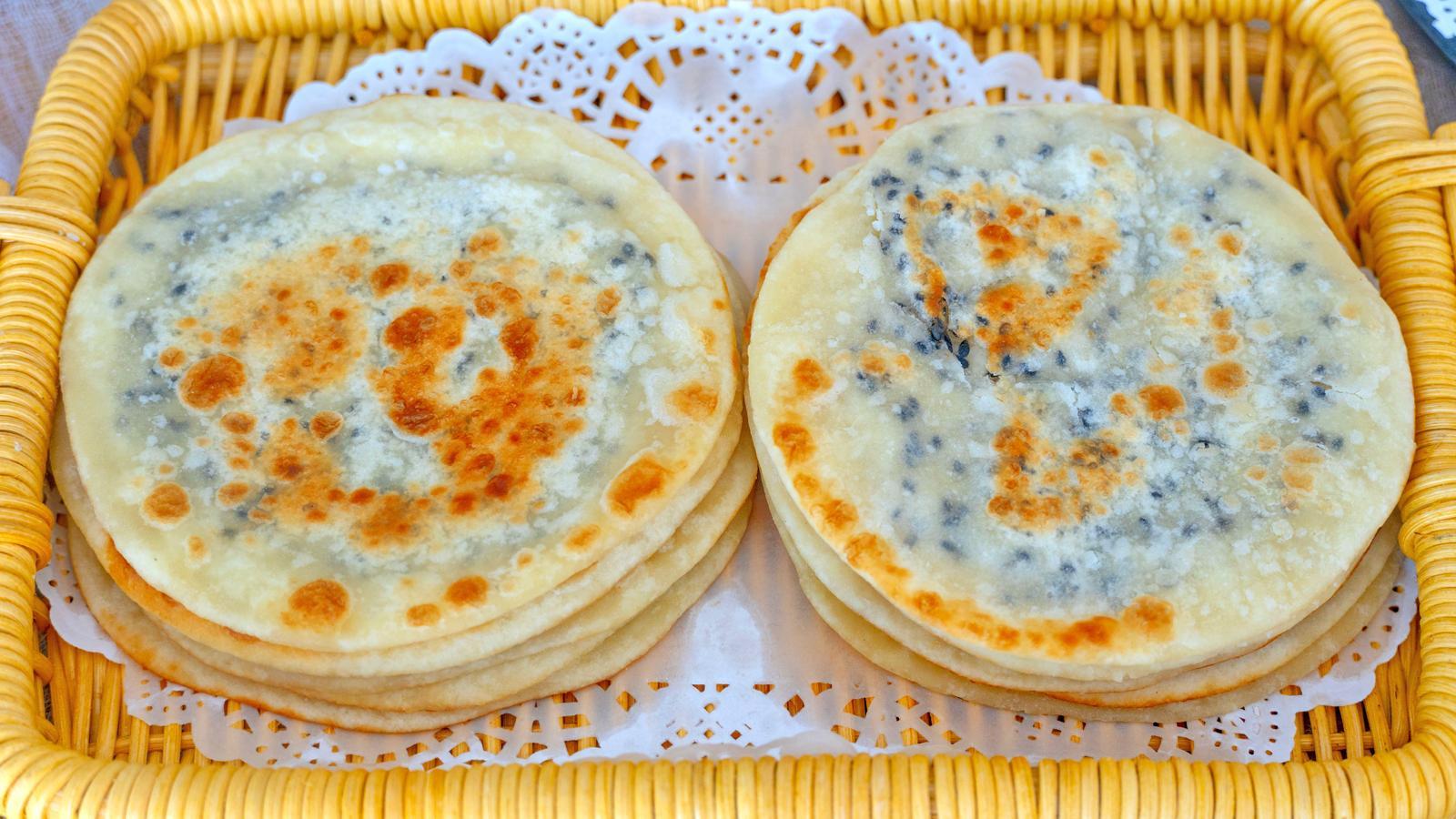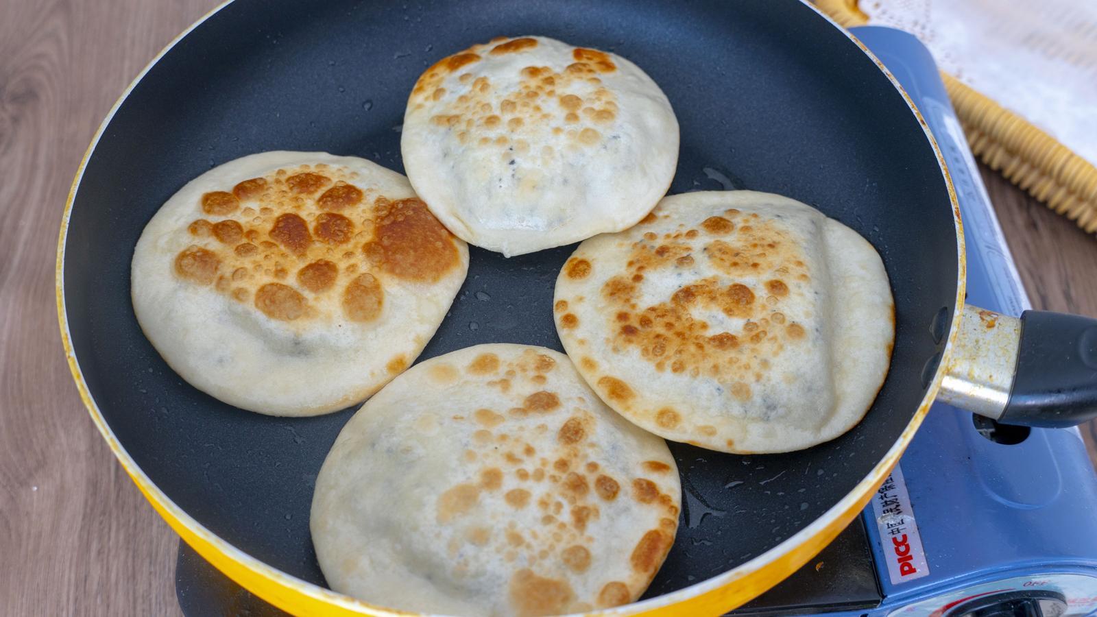 6、这些饼是特别容易熟的,因为饼本身就很薄,而且还是烫面,大约30秒左右就能出锅,盖上盖子、大火,还有提前把锅烧热,都是为了缩短面饼烙制的时间,让这张饼能达到最柔软的状态;