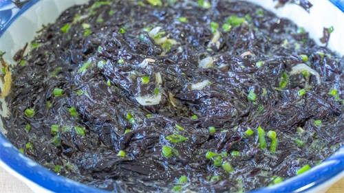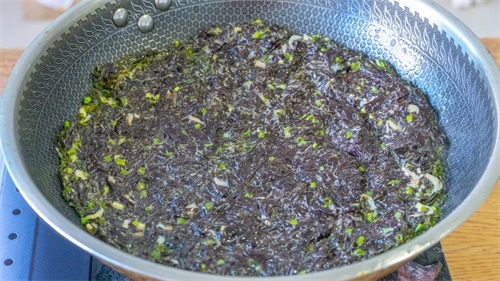 2、泡好后把紫菜里面的水分挤出来,然后改刀切小一点,切好后先放在一旁备用。