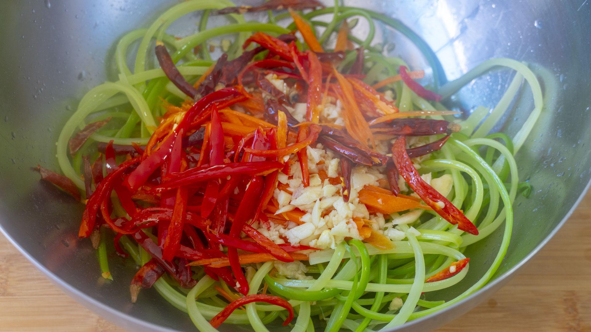 食材:蒜苔、生抽、香醋、鸡精、白糖、盐、胡萝卜丝、蒜末、干辣椒、小米辣、热油