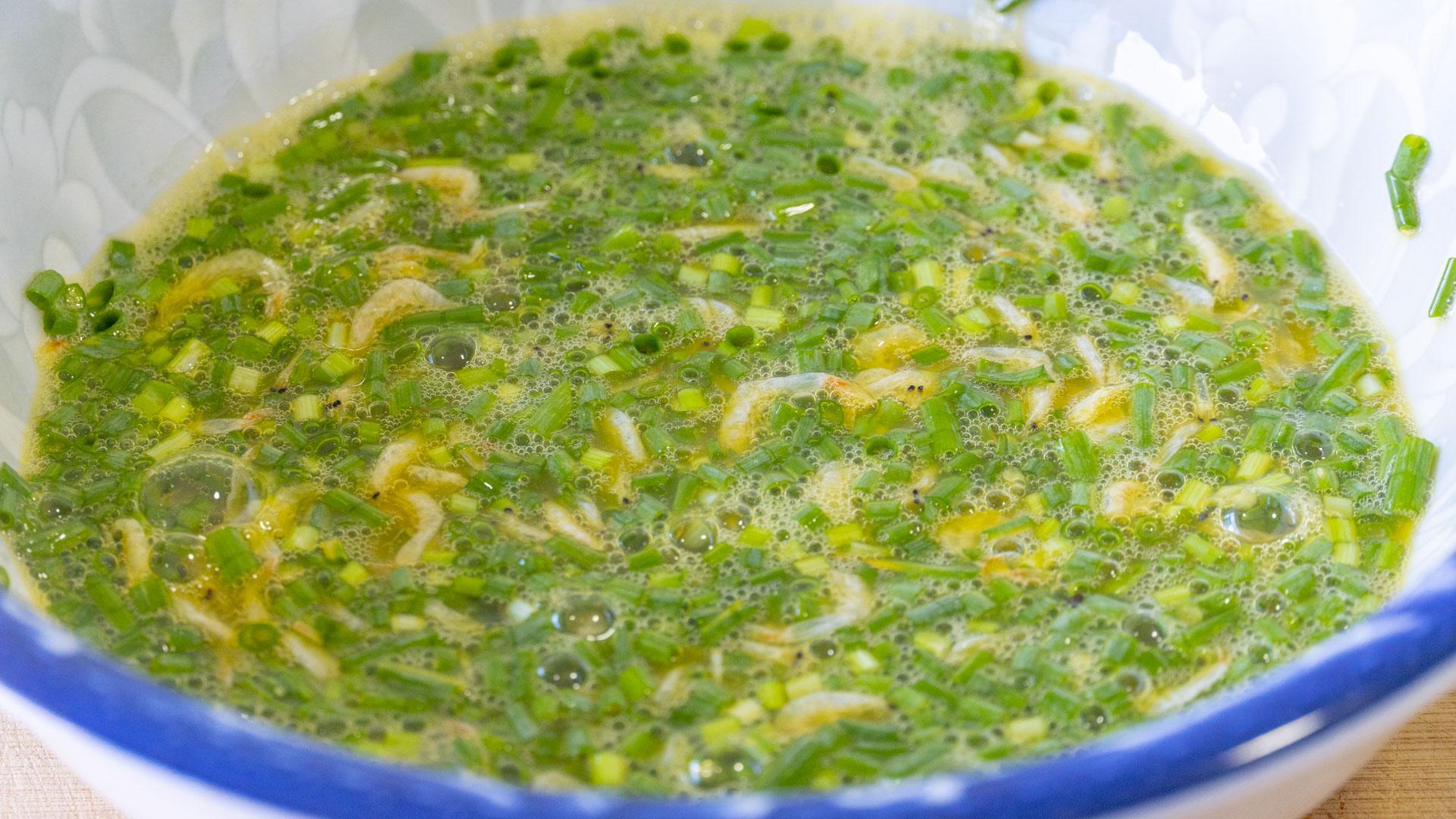 5、接着往蛋液里加一把虾皮、一把葱花,继续搅匀。