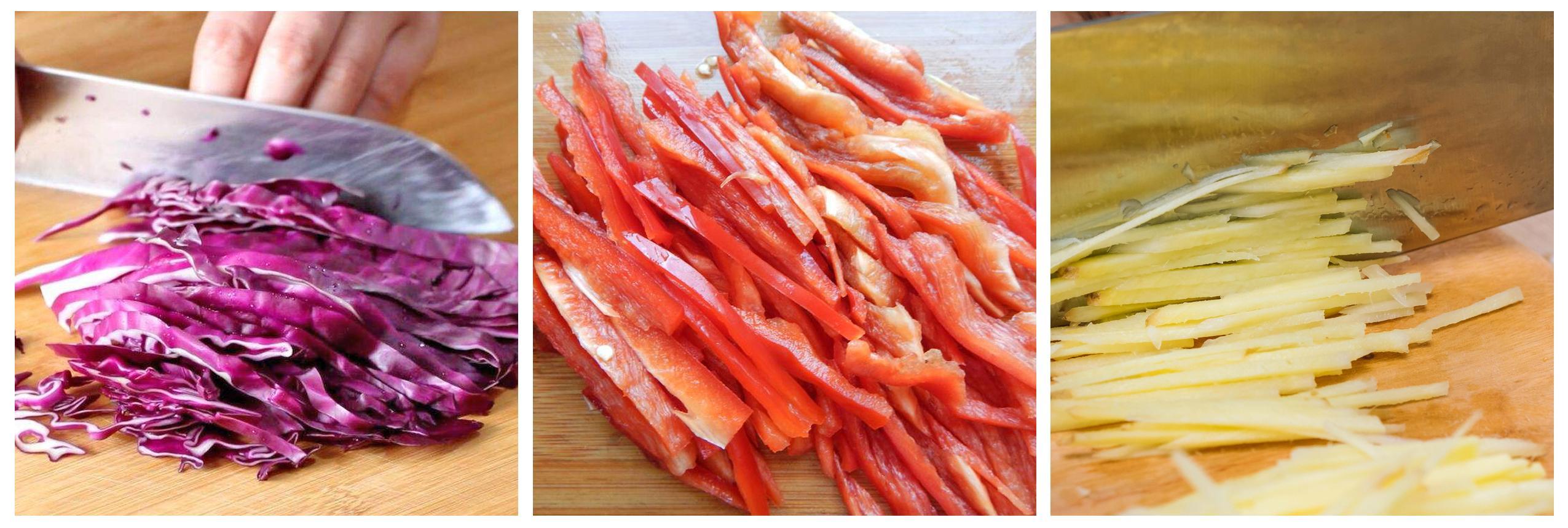 1、紫甘蓝、红菜椒、生姜洗净切丝;