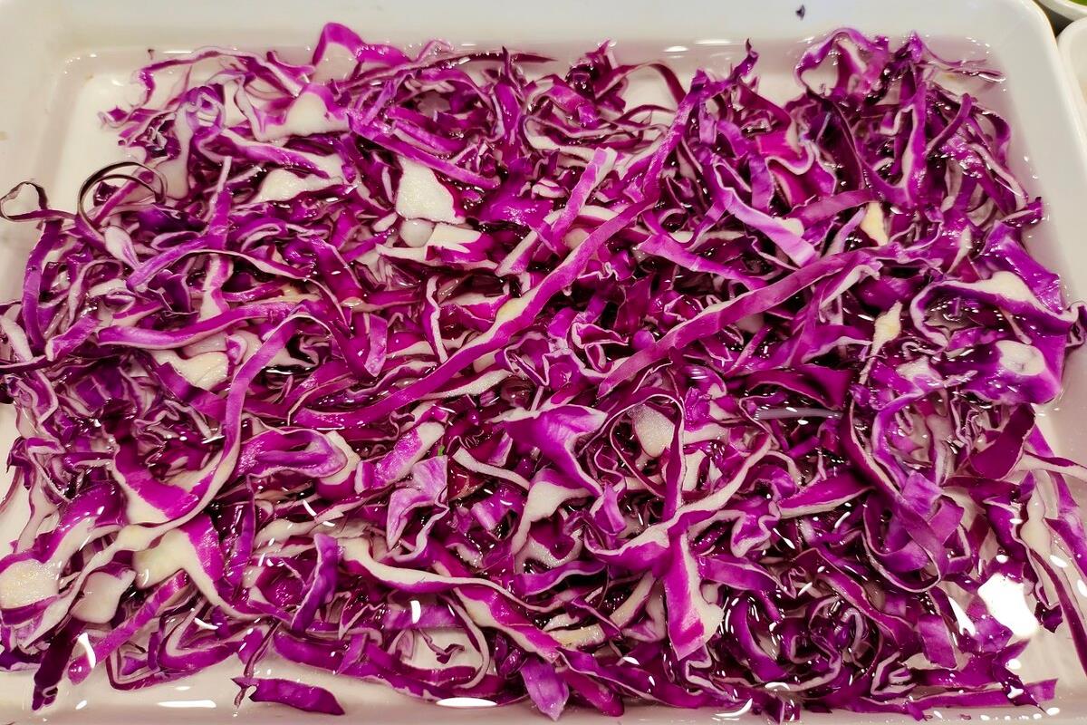 2、切丝后的紫甘蓝加一点盐抓均匀,放10分钟左右,用清水洗干净沥干;