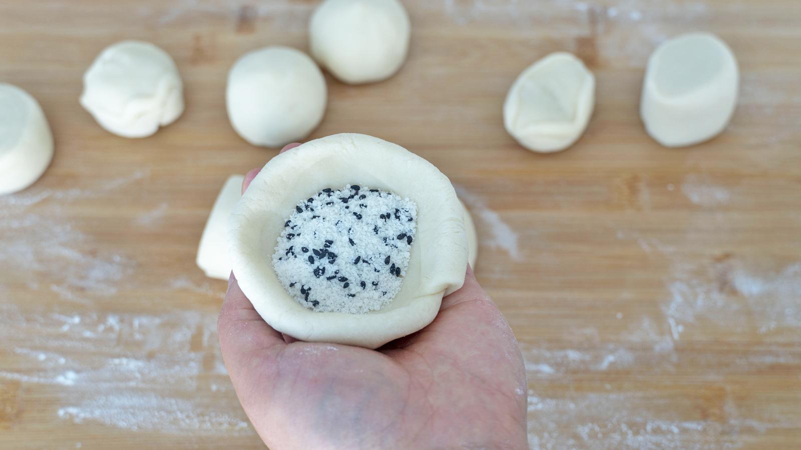 3、砧板上撒干面粉,面团取出来直接搓成长条,分成小面剂,不用揉,先稍微的整理下,直接捏成中间厚边缘薄的小碗状,包上一勺白糖,像包包子一样包起来,收口处一定捏紧实;
