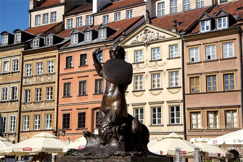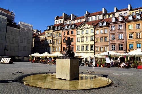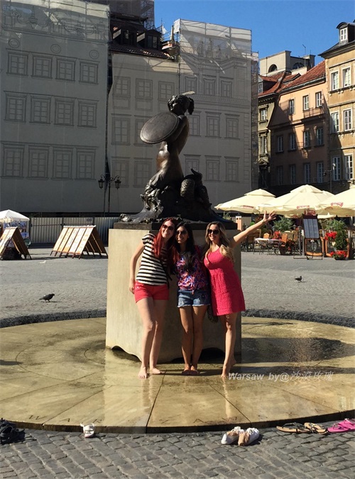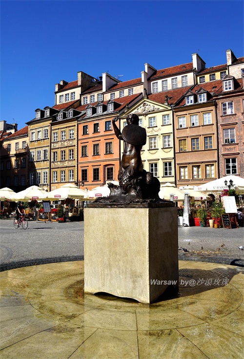 广场中央就是华沙的标志——美人鱼雕塑(statue of the Siren)。这座雕塑于1855年由Konstanty Hegel制作,左手持盾牌右手举起利剑,似乎时刻准备着反击侵略者,告知天下我们的城市是不可侵犯的。