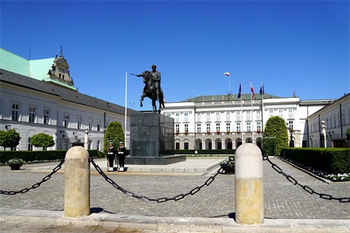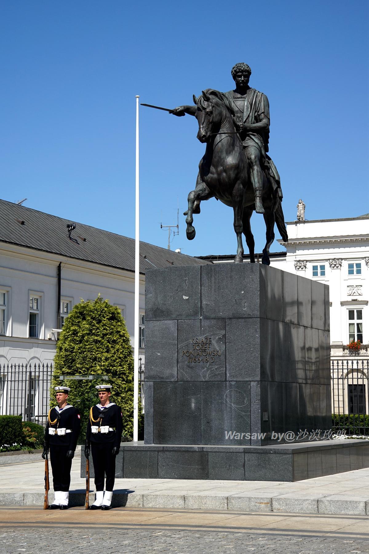 这是建于1818年的华沙总统府(Presidential Palace),前面的雕像是约泽夫·波尼亚托夫斯基亲王(Prince Jozef Poniatowski)
