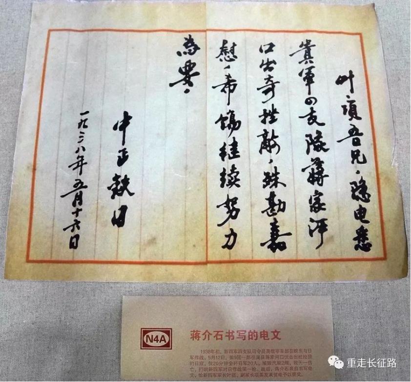 蒋介石就蒋家河口伏击战的胜利给叶挺发的电文