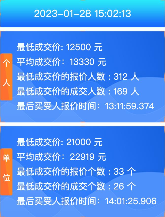 本月,粤A牌个人车牌成交最低价为12500元,比上月的11900元高600元。个人平均价13330元,比上月的12826元高504元。