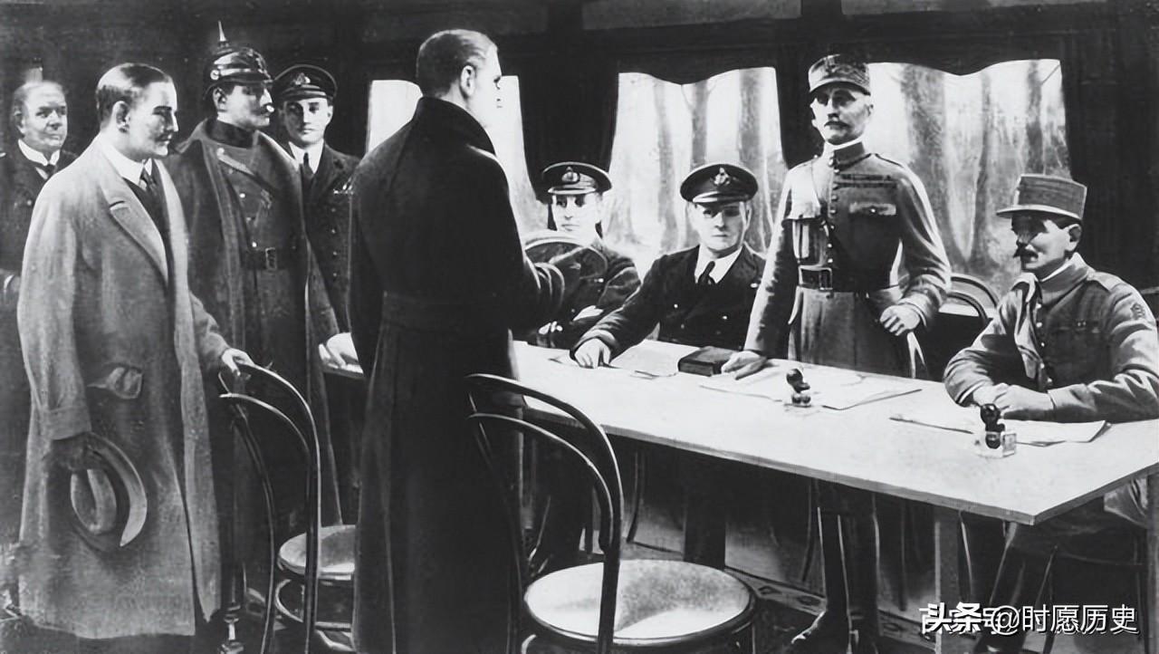 1918年11月11日,德国正式宣布投降。德国代表在巴黎北部的法国东北部贡比涅森林雷道车站的福煦车厢里,签署《贡比涅森林停战协定》。生效时间是上午11点。