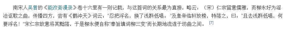 柳永是一位颇具传奇色彩的文人,自诩为“白衣卿相”,而这个名号便是出自这首《鹤冲天》。南宋吴曾的《能改斋漫录》记载了本首词的来历,可供参考:
