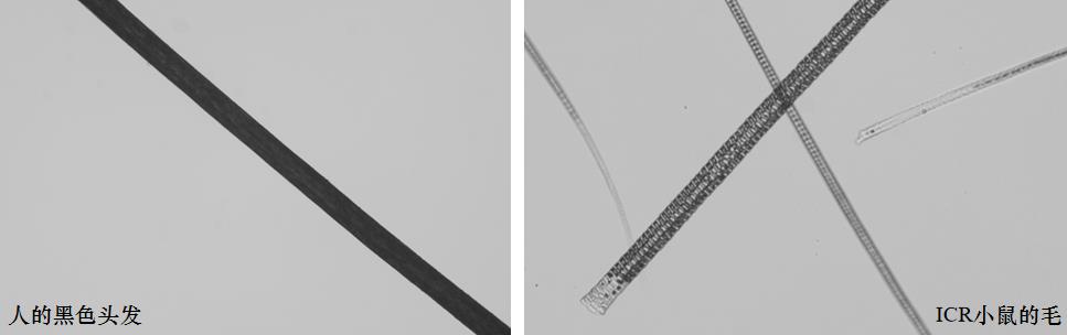 浸泡在矿物油中的人的黑发和ICR小鼠的毛,当矿物油浸润到ICR小鼠毛发的中间空气芯时,呈现出了完全透明的状态,这种结构与北极熊的毛发结构类似/图片来源:作者提供