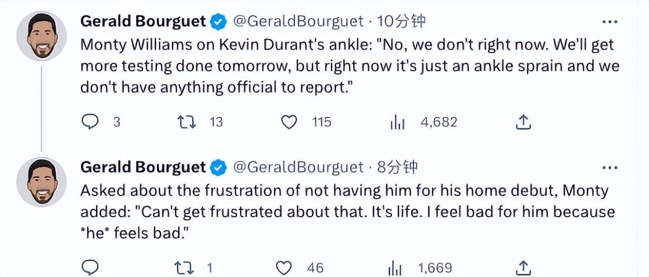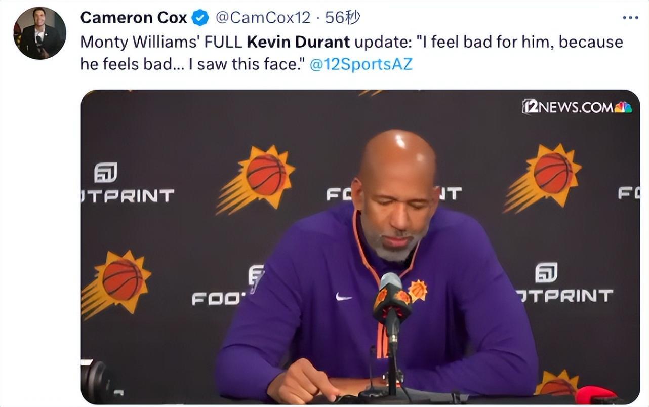 赛后太阳主帅蒙蒂-威廉姆斯透露了杜兰特的最新伤情,他表示,“我为他感到难过,因为他感觉很糟。”蒙蒂继续说道,“我们现在还没有(详细检查报告),会在明天接受更多的检查,现在只是脚踝扭伤。”谈到杜兰特主场首秀被推迟,蒙蒂表示,“不能为此感到沮丧,这就是生活。”