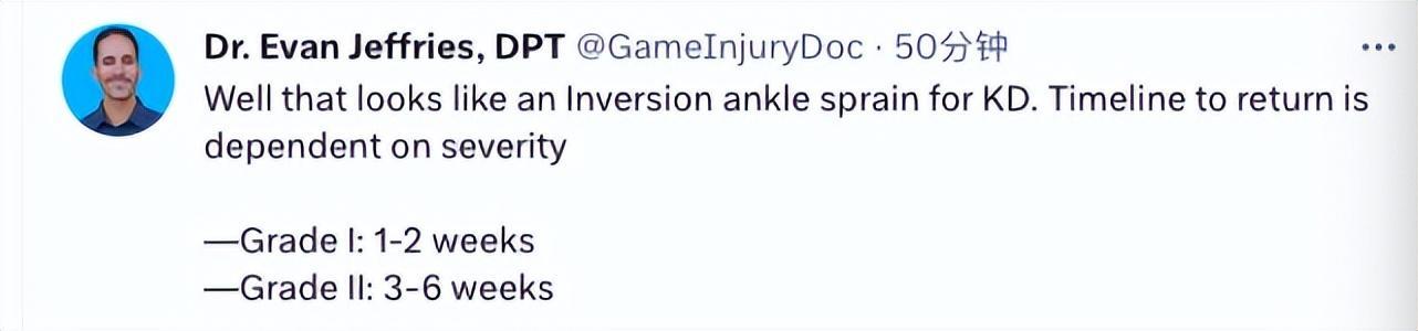 医学专家Evan Jeffries解读了杜兰特的伤情,他表示如果是一级扭伤,杜兰特有可能有休战1到2周,如果是2级扭伤,那他可能要休战3到6周。值得一提的是,杜兰特应该是避免了骨折的情况出现。