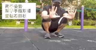 做钻石俯卧撑,要确保自己至少可以做20个以上的普通俯卧撑。让双手足够靠近,大拇指和食指互相触碰,像钻石的形状。