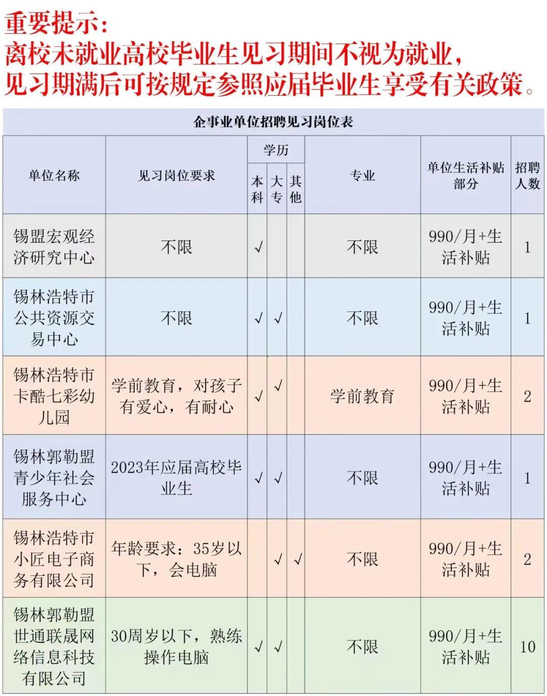(一)见习期限:按照《内蒙古自治区青年见习计划实施方案》有关规定,见习期限一般为3—12个月,具体可根据见习人员特点和岗位要求合理确定;