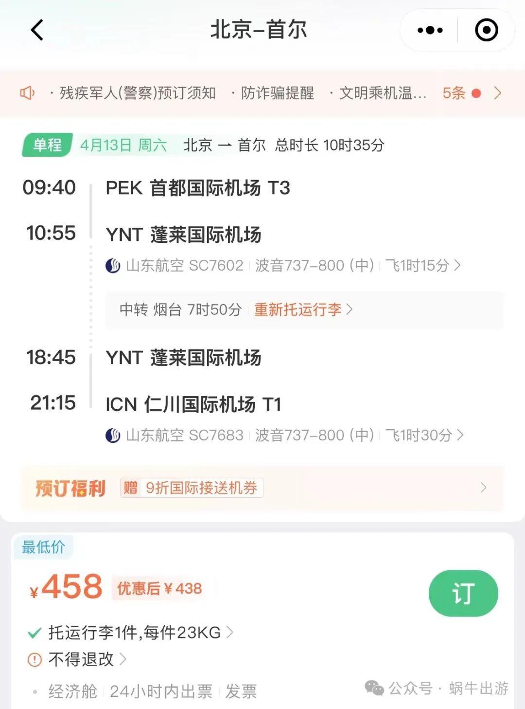 例如北京飞首尔(山航烟台中转),经济舱单程含税458元。