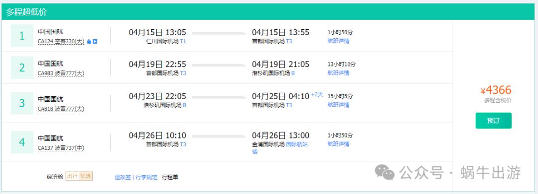 也就是说,2个行程,先从北京往返首尔,休息几天再从北京直飞往返洛杉矶,全程经济舱含税最低只要含税4824元。