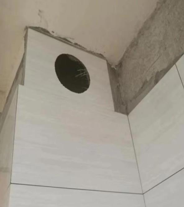 1. 首先就是将原始公共烟道的排烟提到最顶上面,这样可以提前厨房的吊顶高度,增加厨房的空间,然后用一个瓷砖做出直径180MM的圆弧,瓷砖的周围水泥一定可贴满,然后再用结构胶将瓷砖四周进行二次密封,防水油烟从这个位置串味。