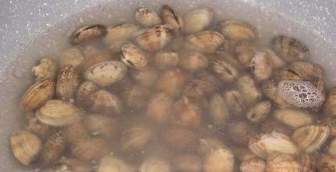 2、将花蚬凉水下锅,放点料酒,然后用小火慢慢加热,这样水不用烧开,慢慢加热等花蚬张开口就可以了,这样就可以了,大家看一下已经张开口了,捞出来放入凉水中,这样给它洗一下,里面的泥沙洗出来。