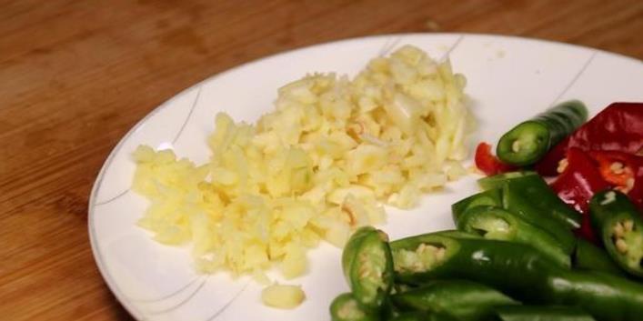 1、准备青红线椒,切斜刀,放入盘中备用,大蒜拍扁剁成末,姜拍扁剁成末