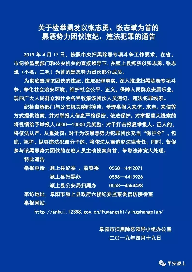 4月17日,按照中央扫黑除恶专项斗争工作要求,在省、市纪检监察部门和公安机关的直接领导下,在颍上县抓获以张志勇、张志斌(小名:三毛)为首的黑恶势力团伙部分成员。