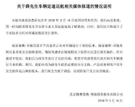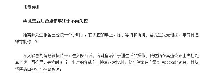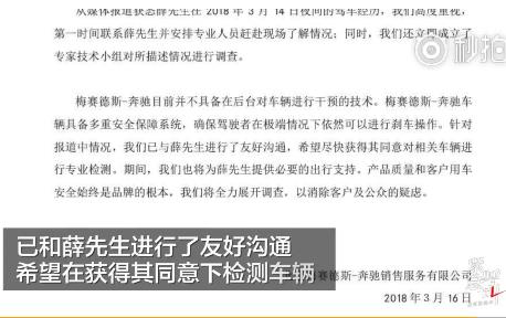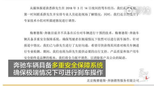 同时,另有媒体向车主薛先生求证,薛先生否认了“奔驰远程控制实现制动”的报道,并表示,“求助未果后,打开车门准备弃车时发现车辆降速,发现车辆减速后,于是通过开关门将车辆下降至刹车正常。